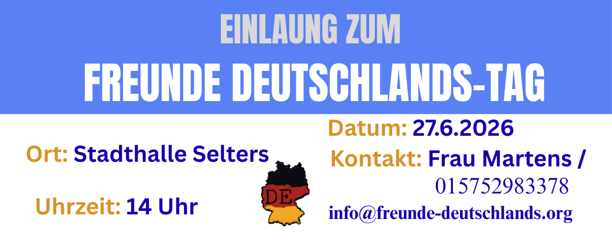 Der Freunde Deutschlands-Tag ist eine besondere Veranstaltung des Vereins Freunde Deutschlands e.V., die Menschen aus unterschiedlichen Kulturen, Herkunftsländern und Lebenswegen zusammenbringt. Ziel dieses Tages ist es, den interkulturellen Austausch zu fördern, das gegenseitige Verständnis zu stärken und die Vielfalt in unserer Gesellschaft sichtbar zu machen.